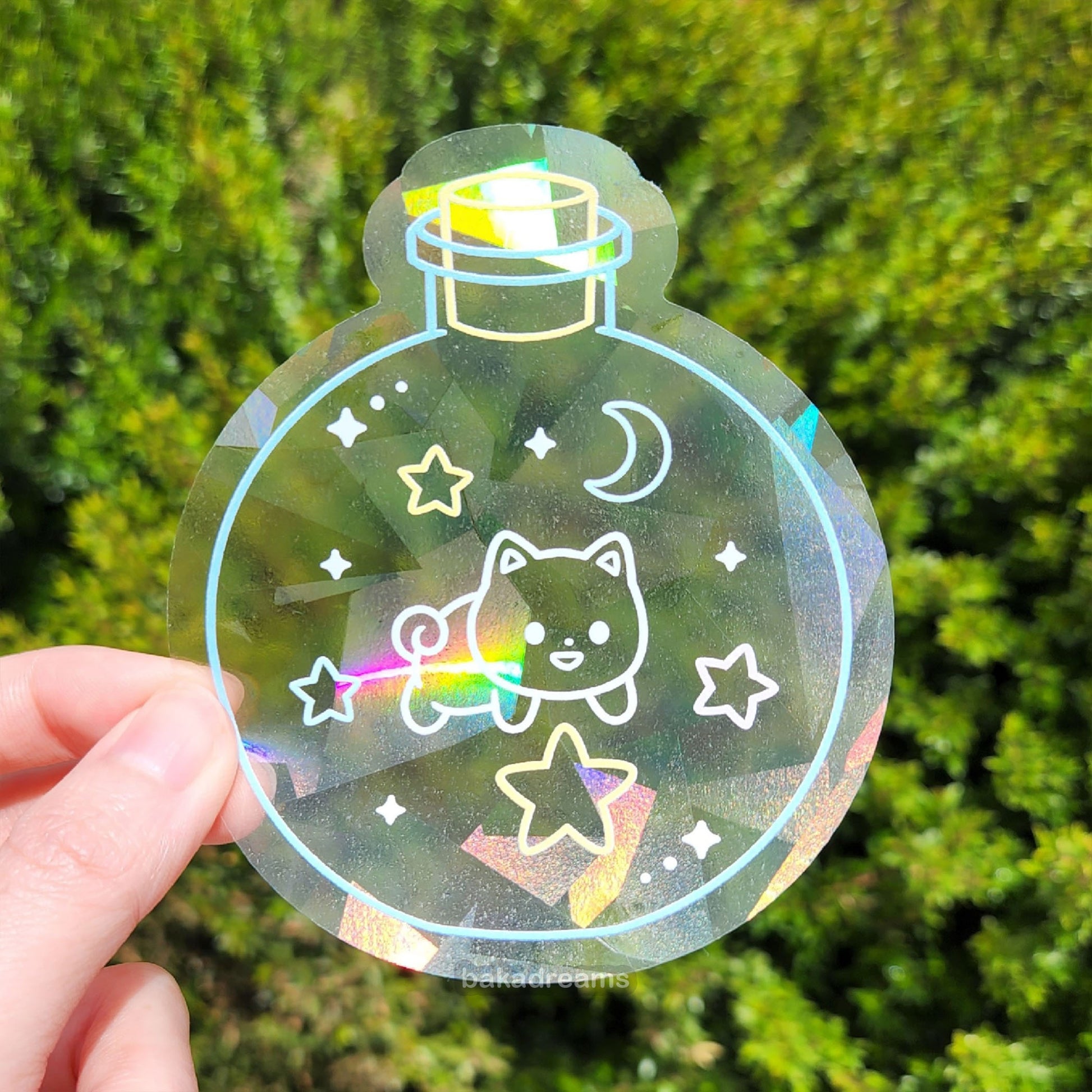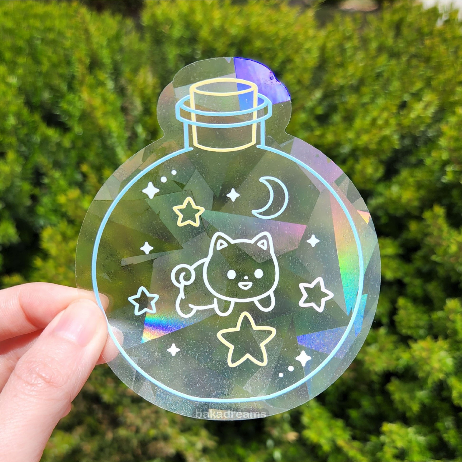 A cute suncatcher featuring a shiba floating in a bottle with stars! The suncatcher is professionally made with a special diffraction film that creates rainbows when placed in direct sunlight.